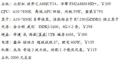 A10-7850K这款高端APU四核相当于i34150+R7250(GDDR5)的配置组合了,再加上8G双通道内存,这个性能已经很不错了