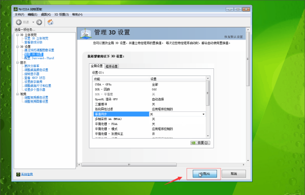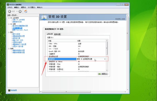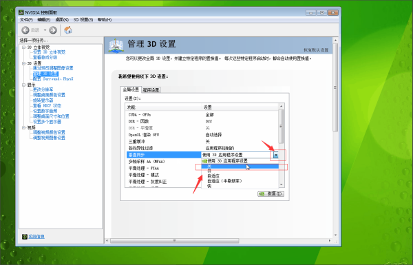 3. 在右面出现的列表中找到“垂直同步”这个选项,把鼠标移到后面的使用3D应用程序设置这个位置。