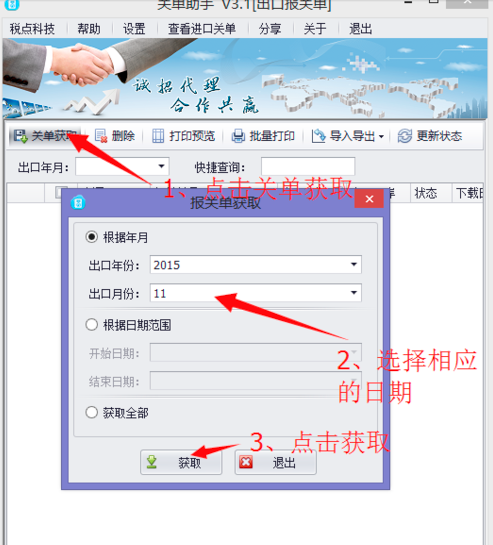 2、设置口岸密码完毕之后点击关单获取,选择要下载的日期信息,点击获取。获取完毕之后点击退出。