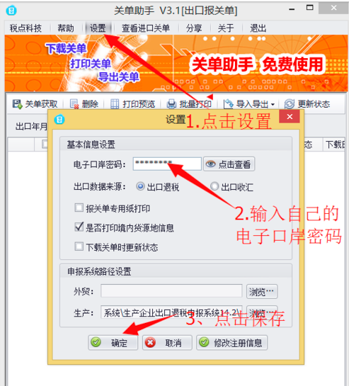1、注册账号,然后登陆,成功之后,点击设置,输入自己的电子口岸密码,并保存。