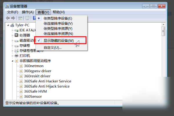 3、展开“设备管理器视图”菜单,选择“显示隐藏的设备”,然后在“非即插即用”驱动程序下找到“虚拟WiFi过滤驱动程序”,双击“虚拟WiFi过滤驱动程序”,打开属性框,选择“驱动程序”选项卡,按“停止”按钮。