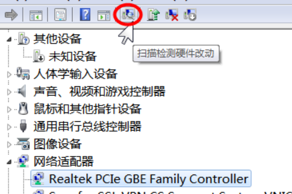 6、点击工具栏中的"扫描检测硬件改动"按钮,系统会自动生成刚才删除网络设备。