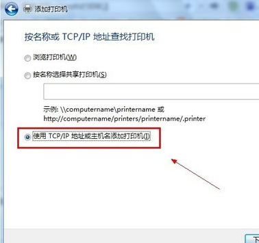 5、在【按名称或TCP/IP地址查找打印机】下面点击【使用TCP/IP地址或主机名添加打印机】