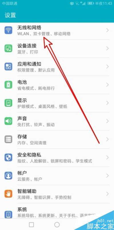 方法一:我们在打开的华为手机设置页面中,可以看到“无线和网络”的设置项。