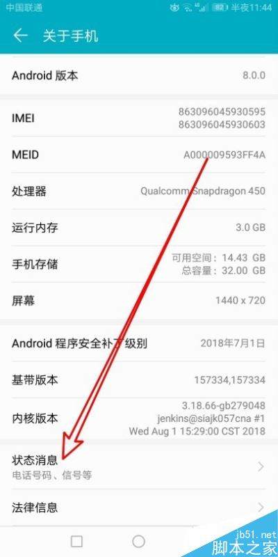 在打开的关于手机页面中,点击“状态消息”菜单项。