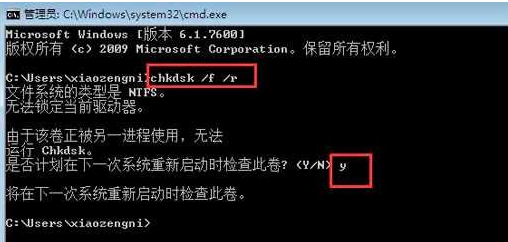 在命令提示符下输入“chkdsk /f /r”按回车,然后按y,下次重新启动电脑时,操作系统会自动修复硬盘。