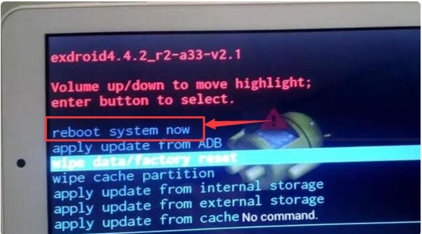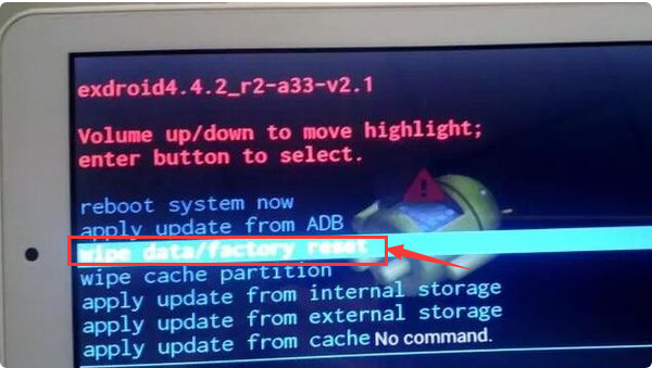 第一步、先将平板电脑关机,在关机状态下同时按住开机键和音量减键,8秒后同时放开,这时平板电脑就会进入到recovery英文菜单界面。然后选择第3项:wipe data/factory reset: