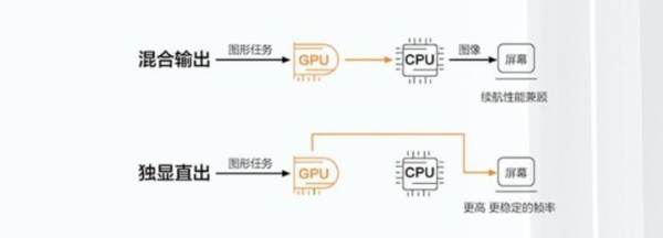 经常关注游戏本,或许你听过独显直连和混合输出等名词,它们分别代表什么意思?可以参考下图:
