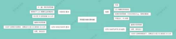 英伟达显卡有多种型号,目前常见的有MX450 2G 显卡、GTX 1650 4G 显卡、GTX 1650Ti 4G 显卡、GXT 1660Ti 6G 显卡、RTX 20 系列显卡以及即将发布的RTX 30 系列显卡,他们大致能够胜任的工作,可以参考下图: