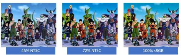 色域可以简单的理解为色彩饱和度,目前色域标识有45%NTSC、72%NTSC、100%sRGB、100% Adobe RGB,通常情况下,45%NTSC 称为普通色域(低色域),72%NTSC、100%sRGB 称为高色域,100% Adobe RGB 称为广色域,它们之间的差异,可以参考下图: