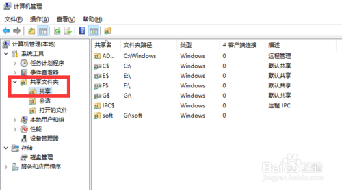 从打开的“计算机管理”窗口中,展开“共享文件夹”-“共享”项,即可在右侧查看当前计算机所共享的所有文件夹信息。