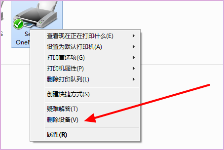 2、然后在弹出来的窗口中右键单击正在连接的打印机,选择“删除设备”。如图所示