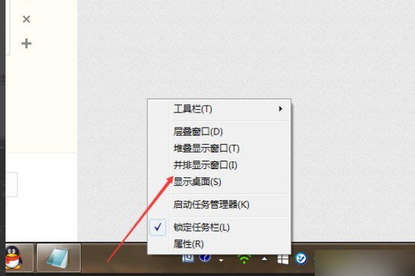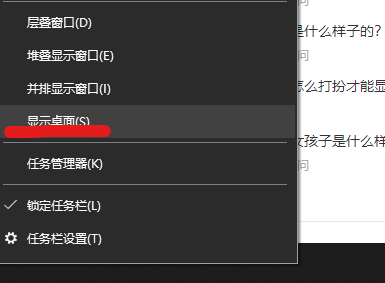 方法四:在系统任务栏中单击鼠标右键,在跳出的菜单中选择显示桌面,即可快速回到桌面。