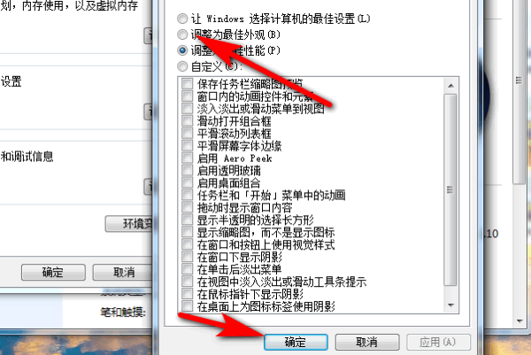 4、在弹出的【性能选项】窗口中,勾选【让Windows选择计算机的最佳设置】或者【调整为最佳外观】,然后点击下面的【确定】就可以了。