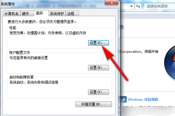 3、在弹出的【系统属性】面板中,点击【高级】选项卡下的【设置】。
