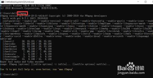 在命令行窗口中输入ffmpeg,如果提示ffmpeg命令的使用法就代表ffmpeg软件安装成功