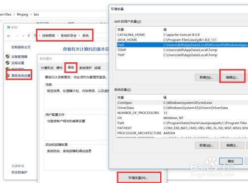 打开控制面板->系统与安全->系统,点击系统界面左窗口底部的"高级系统设置",在高级选项卡中点击底部"环境变量...",最后选中path路径变量,点击编辑按钮