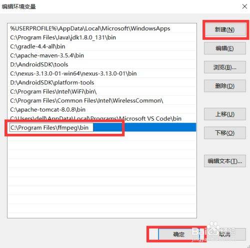 在path编辑界面添加ffmpeg的bin路径,最后点击确定按钮