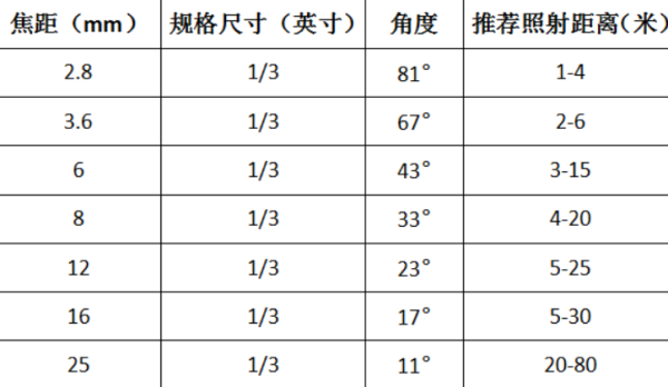 视角在 30 度以上,用于 20*30 米左右场所,如 12mm\16mm;