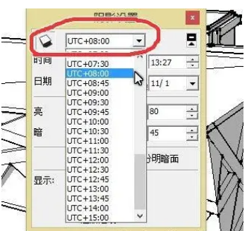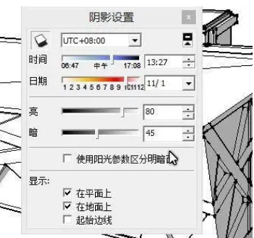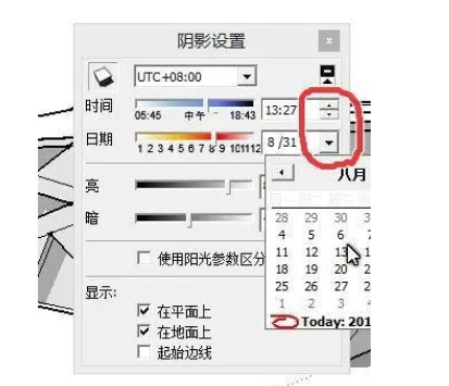 4、SketchUp设置阴影,点击红色圆圈绘制的部分进行调整。调影时间可精确到每天每一分钟。绘制在红色圆圈内的部分用于调整模型暗部和亮部的亮度。你可以自己调整和感受具体的变化。