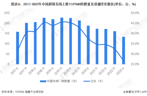 作为世界高性能计算领域规模最大的权威会议之一,国际高性能计算大会每半年公布一次全球超级计算机TOP500榜单。2017-2022年,全球超级计算机TOP500榜单上,来自中国内地的超算系统数量呈现先上升后下降趋势,主要由于2020年起中国停止向TOP500组织提交最新超算系统信息,故此后数量和算力占比均有所下滑。2022年11月,来自中国内地厂商为162家,占比32.4%,位列世界第一。2023年6月,中国内地超算系统上榜TOP500数量从162台下降到134台,占比26.8%,位列世界第二。