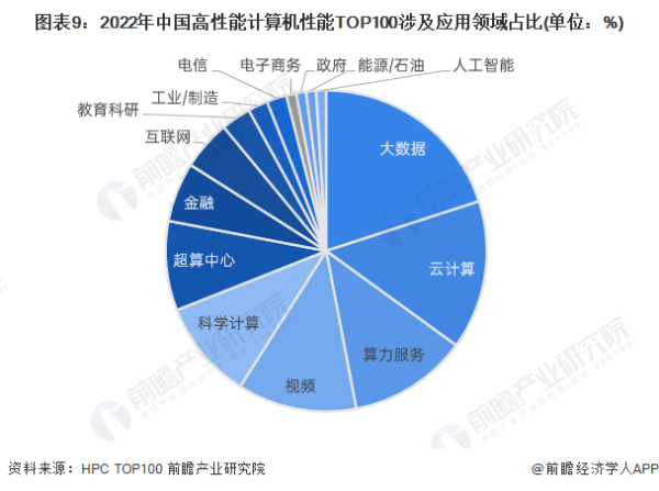 在2022年11月中国高性能计算机性能TOP100中,所涉及最多的领域为大数据领域,占比20%;其次为云计算领域,占比15%;算力服务与视频领域占比均为12%。