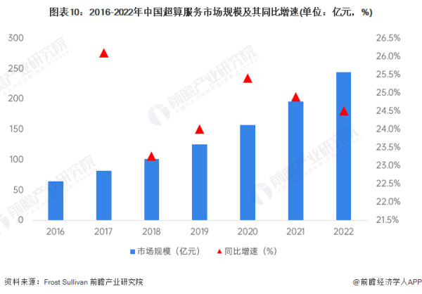 Sullivan的调研数据,2016-2021年中国超算服务市场规模的复合增长率达24.7%,2021年市场规模为196.6亿元,2022年增速约24.5%,据此测算,2022年中国超算服务市场规模约244.8亿元。