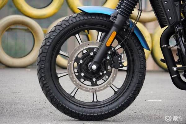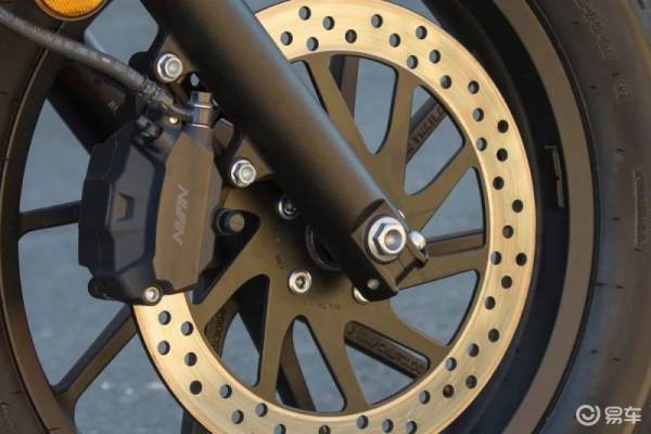 CM300的轮组设定更贴近BOBBER风格,前轮使用了直径与后轮相同的16寸铝合金压铸轮毂,宽厚的前130/90-16、后150/80-16轮胎具有更强的视觉冲击力。在轮胎和刹车的配置上CM300凭借dunlop轮胎和NISSIN刹车卡钳的运用,取得了一定优势,但在实际骑行中,130/90-16规格的前轮轮组被巨大自重造成的转动惯性拖累,它的制动性能只能用“将将够用”来形容。
