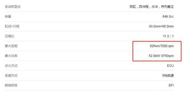 尽管没有试骑,但是不妨碍我们探讨下这款车的性能如何。因为这款车在动力上的数据已经公示——排量650cc,水冷并列双缸,最大功率为52kw/8500转,最大扭矩62N.M/7000转。而这个数据与春风国宾650简直是一模一样,如图。