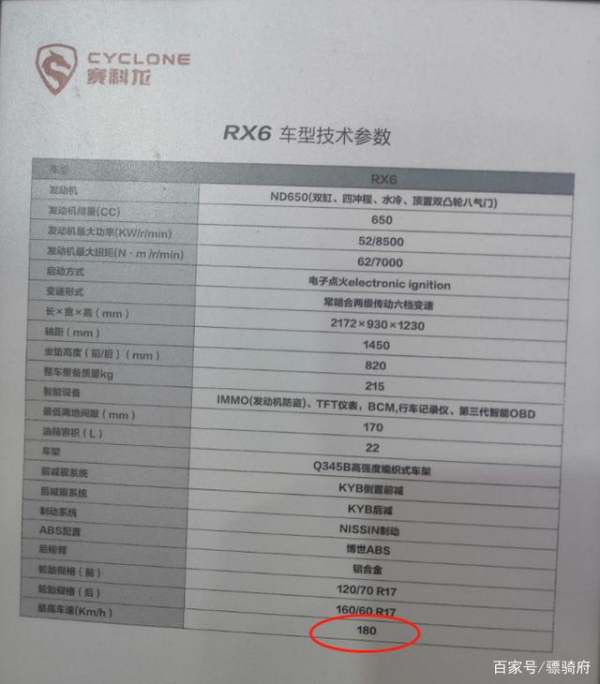 而赛科龙RX6的极速成绩,根据厂商宣布的数据,是180KM/H,如下图。