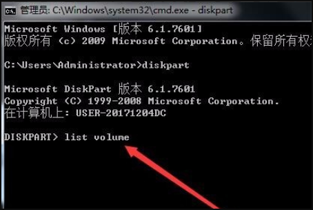 4、现在在磁盘管理命令模式下,键入列表卷并按回车键。