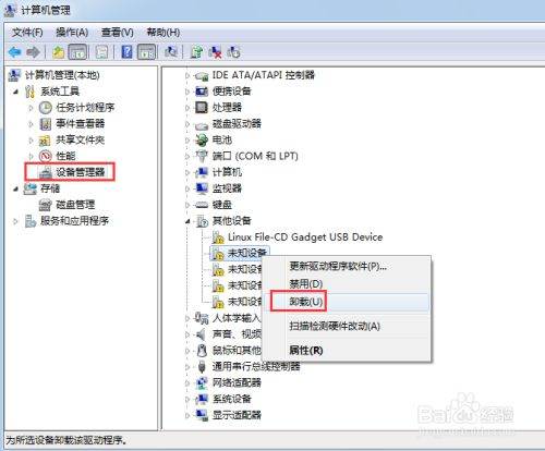 待打开“计算机管理”窗口后,选中“设备管理器”项,在右侧找到“未知设备”,如果其中存在未知设备,则右击选择“卸载”项以删除未知设备。