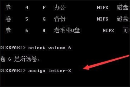 7、接下来,我们需要修复usb闪存驱动器或移动硬盘的符号。只需输入命令assignletter=Z,其中Z是要修复的符号。
