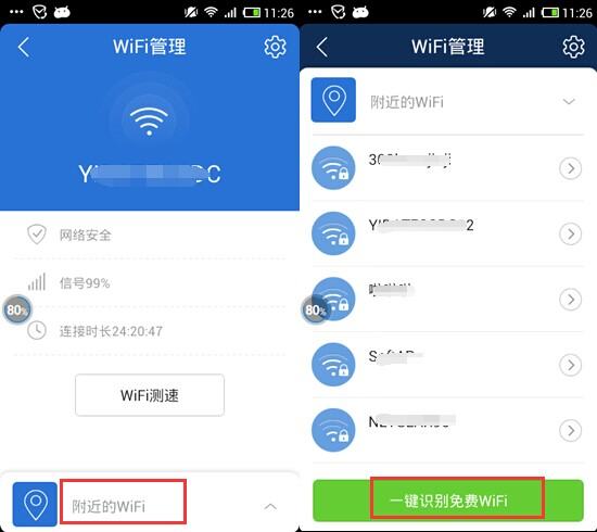 2、点击【附近的WIFI】,可以查看附近所有WIFI,想要链接免费安全WIFI时,点击【一键识别免费WIFI】按钮查看结果后,即可连接。