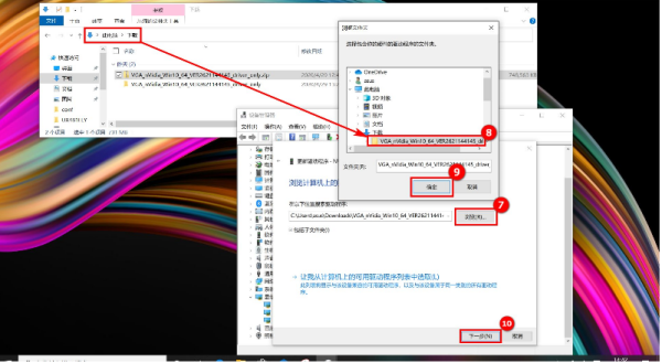 (5) 点击 ⑦[浏览],在弹出的窗口中找到下载好的 ⑧[驱动程序],点击 ⑨[确定],点击 ⑩[下一步]。