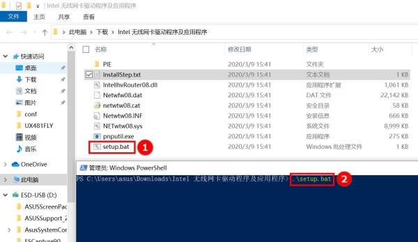 (5) 在第二步找到 ①[Input.\xxxxx](也就是 setup.bat 文件),在 [Windows PowerShell]中输入以 ②[.\setup.bat]为例子的文件,然后按下键盘上的 [Enter]键。
