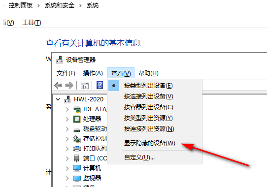 4、最后,在工具栏的弹出窗口中单击查看,单击显示隐藏的设备即可,如下图所示。