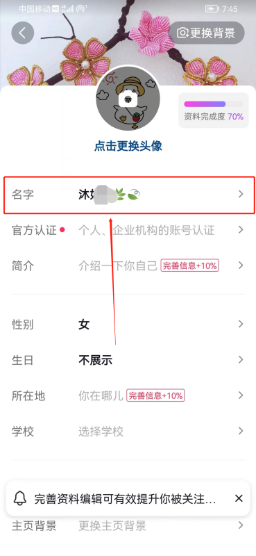 2、点击【名字】的入口,这里更换头像也可以哦;