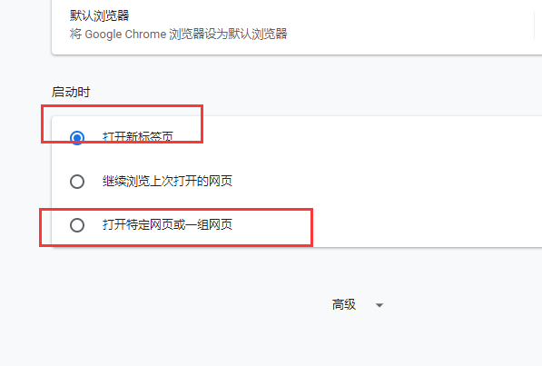 8、此时可以看到之前设置的打开特定网页已经取消勾选自动设置为了打开新标签。