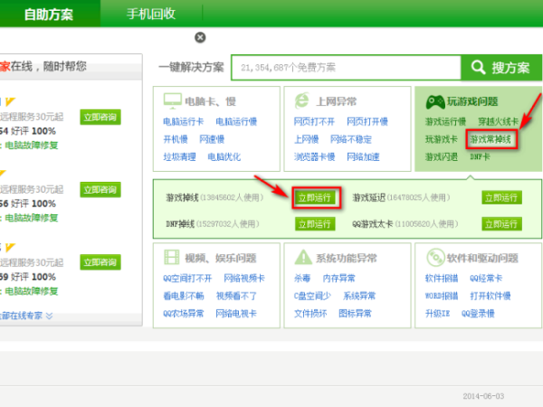 2、在右侧【玩游戏问题】中,点击【游戏常掉线】选择【立即运行】。