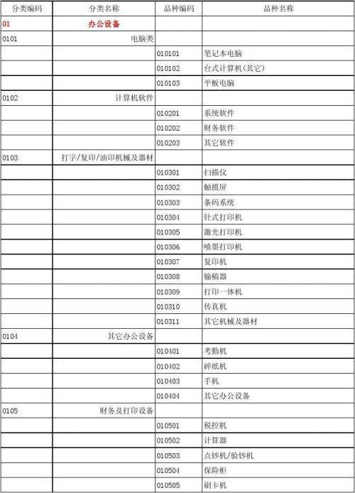可以根据公司情况自己编码。可以将公司的固定资产分类一下,根据固定资产的多少可设三级或更多级的编码,如:办公设备编码设为01,办公家具编码设为02...。那么“电脑”属办公设备,可以编码为0101,第一台编码即0101001,第二台为0101002;以此类推。