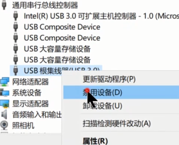 3、找到“通用串行总线控制器”下的“USB根集线器”,对每个选项执行右键“禁用”。