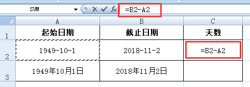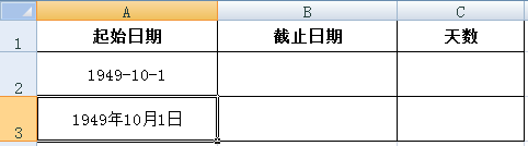 1、以2007版EXCEL为例,打开EXCEL,在任意单元中输入起始日期(如:1949年10月1日),如下图:在A2单元格输入1949-10-1,也可输入1949年10月1日(见A3单元格)