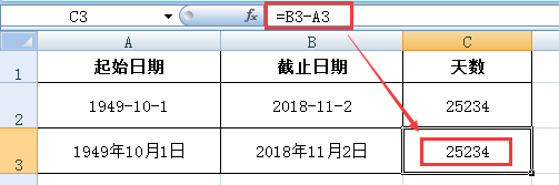 3、在“天数”列下的C2、C3单元格输入公式:=截止日期-起始日期,即=B2-A2/=B3-A3,按回车完成公式设置