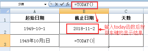 2、在B2、B3单元格分别输入函数:TODAY(),输入today函数显示的是打开EXCEL表格当天的日期