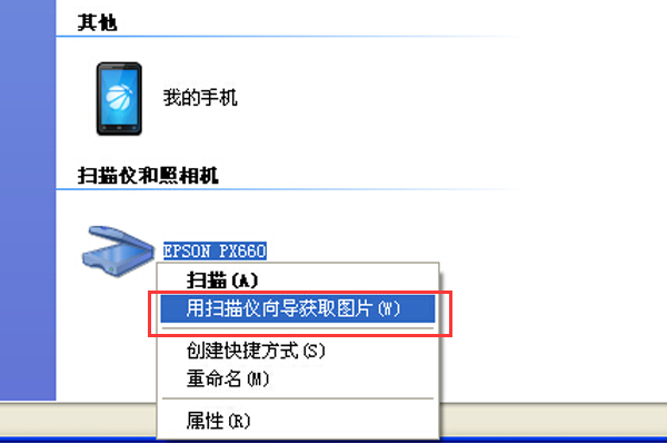 2、选中该扫描仪以后右键点击,选择用扫描仪向导获取图片。
