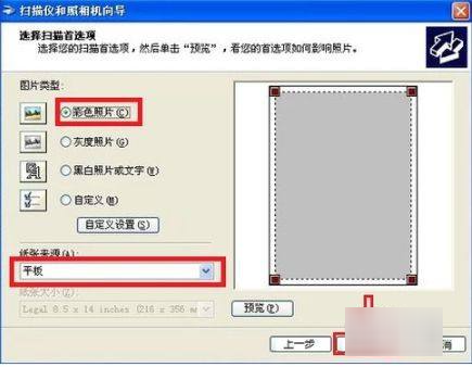 5、根据提示选择选择图片类型【彩色照片】,纸张来源【平板】,再点击【下一步】。