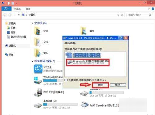 3、在弹出的对话框中选择【扫描仪和照相机向导】,点击【确定】。