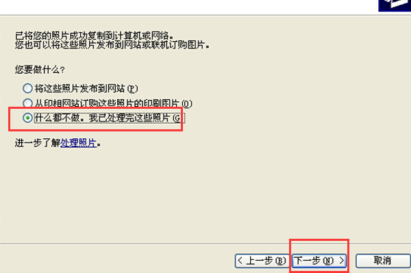 6、此时在弹出的页面对话框中勾选什么都不做,我已处理完这些照片以后,点击下一步。