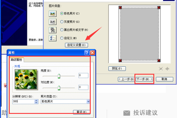 4、此时在弹出的扫描界面对话框中可以点击自定义设置来对扫描图片进行相关的设置,完成设置以后点击下一步按钮。